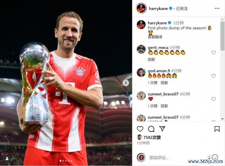 凯恩更新社媒动态, 中超晒出手捧德超杯第一名 奖杯的照片, 游泳快讯配文:“本赛季第一波照片大放送!”
